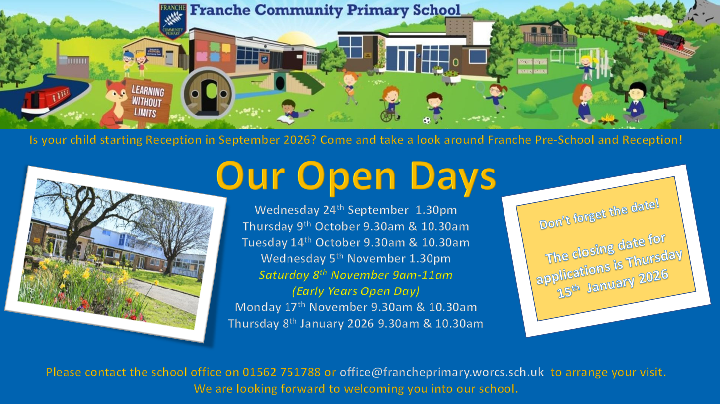 Welcome to our website! At Franche Primary, we are learning without limits. Contact our office to arrange a school visit: office@francheprimary.worcs.sch.uk 01562 751788